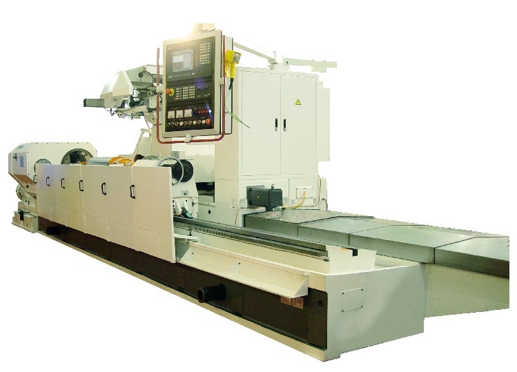 本機(jī)床采用砂輪架移動(dòng)式機(jī)床布局,砂輪架拖板作縱向往復(fù)移動(dòng);砂輪架在拖板上作橫向運(yùn)動(dòng),砂輪主軸旋轉(zhuǎn)和主軸偏心旋轉(zhuǎn)均由靜壓軸承支承。機(jī)床具有中凸(凹)機(jī)構(gòu),裝置于砂輪架中以產(chǎn)生微量進(jìn)給磨削中凸(凹)量。工件只作旋轉(zhuǎn)運(yùn)動(dòng)并可無(wú)級(jí)調(diào)速。砂輪架導(dǎo)軌采用靜壓導(dǎo)軌,拖板導(dǎo)軌采用靜壓貼塑導(dǎo)軌。機(jī)床配有可調(diào)整的中心架以支承不同直徑的工件。 機(jī)床采用西門子840D數(shù)控系統(tǒng),控制砂輪架拖板縱向進(jìn)給、砂輪架橫向進(jìn)給、中凸(凹)機(jī)構(gòu)及測(cè)量(帶測(cè)量裝置)等運(yùn)動(dòng),實(shí)現(xiàn)機(jī)床的四軸兩聯(lián)動(dòng),機(jī)床可實(shí)現(xiàn)自動(dòng)進(jìn)給、自動(dòng)補(bǔ)償?shù)饶ハ餮h(huán)。砂輪主軸旋轉(zhuǎn)和主軸偏心擺動(dòng)潤(rùn)滑,配有獨(dú)立靜壓油箱并具有溫控功能。導(dǎo)軌潤(rùn)滑油由床身內(nèi)的油池提供。冷卻系統(tǒng)采用大流量,帶磁性分離器和紙質(zhì)過(guò)濾冷卻液箱。本機(jī)床備有自動(dòng)測(cè)量裝置和砂輪動(dòng)平衡儀等,供用戶在訂貨時(shí)根據(jù)需要選購(gòu)。 規(guī)格和主要技術(shù)參數(shù):
